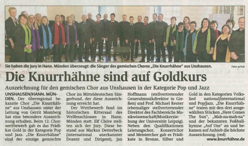 Und dann waren wir dran: „Und wir verleihen dem Chor „Die Knurrhähne“ … die Spannung unter uns konnte man greifen … unter der Leitung von … Sekunden werden zur Unendlichkeit … Gerrit Momberg … alle hielten den Atem an … in der Kategorie Pop und Jazz … und, und, und??? … das Prädikat GOLD!“